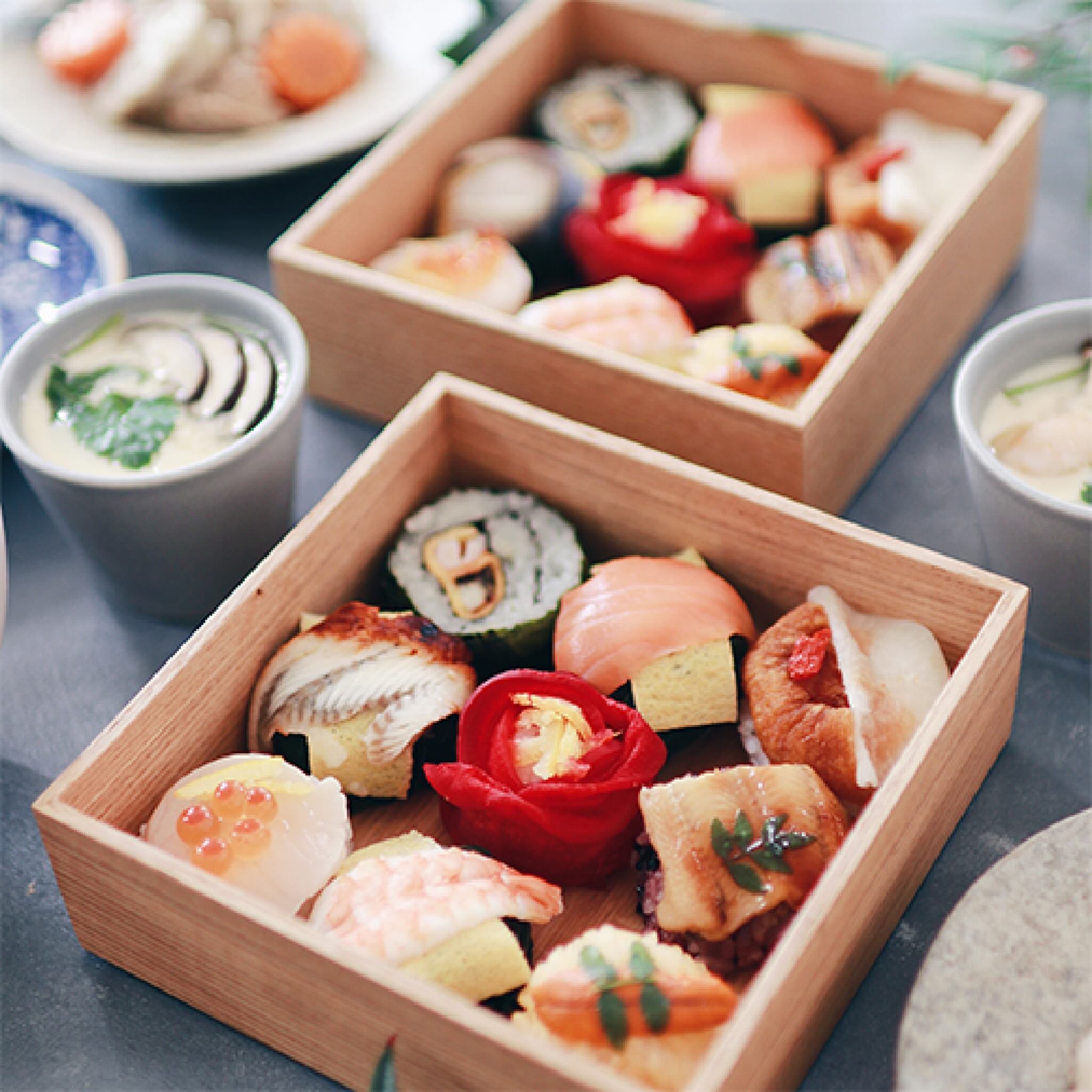 さらに、いくら錦糸巻やチキンの柚子胡椒手鞠、海老アボカド手綱巻、ローストビーフ手鞠、炙りサーモン棒寿司など、人気の華やか手鞠寿しを詰め合わせ。