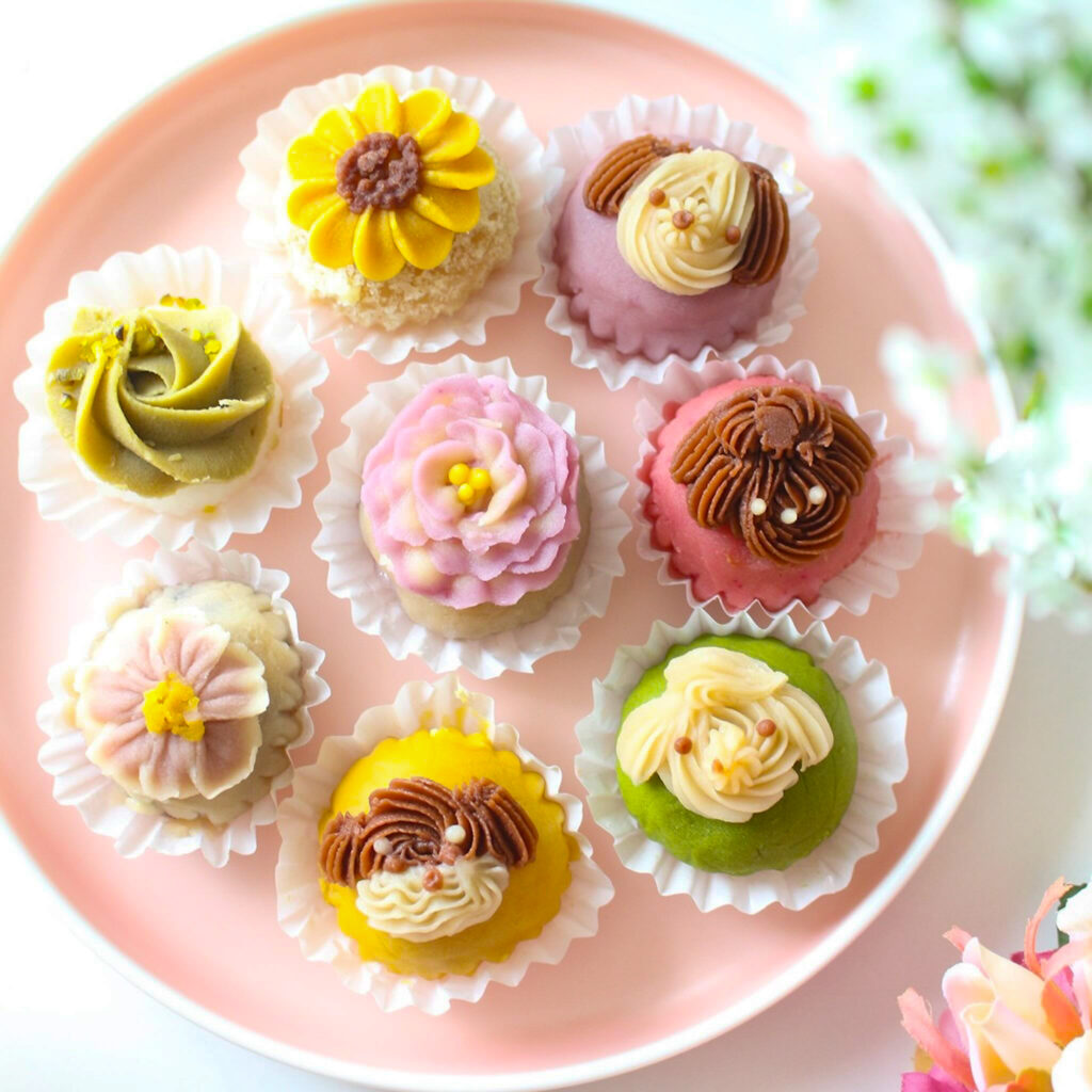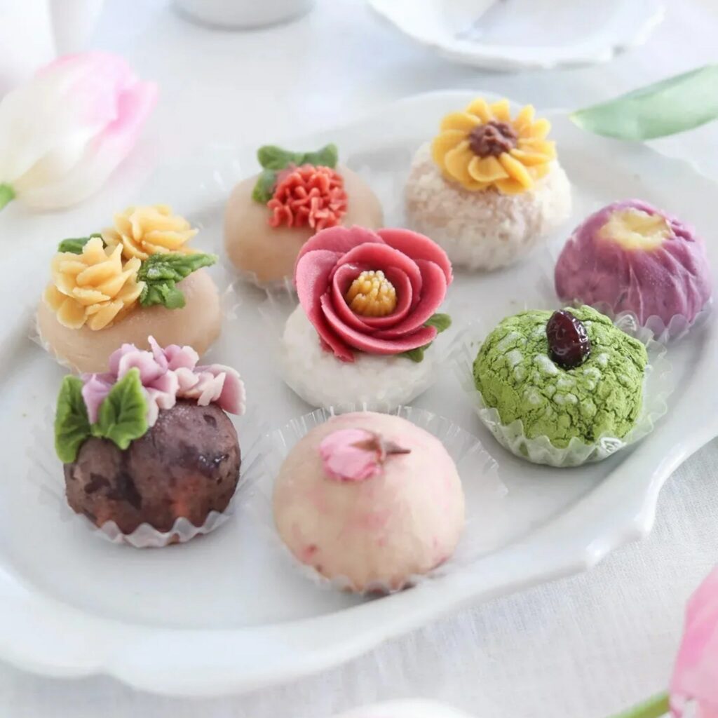 昔ながらの自然なおはぎにこだわり、保存料や着色料は使用せず、ひとつひとつ手作りでお作りしました。砂糖は白砂糖ではなく『てんさい糖』を使用し、コクとまろやなか甘みのおはぎに仕上げました。美しいお色の餡はすべて、野菜や果物などを素材の色で色付けし、季節のお花を表現しました。心がほっとするひとときをお届けします。