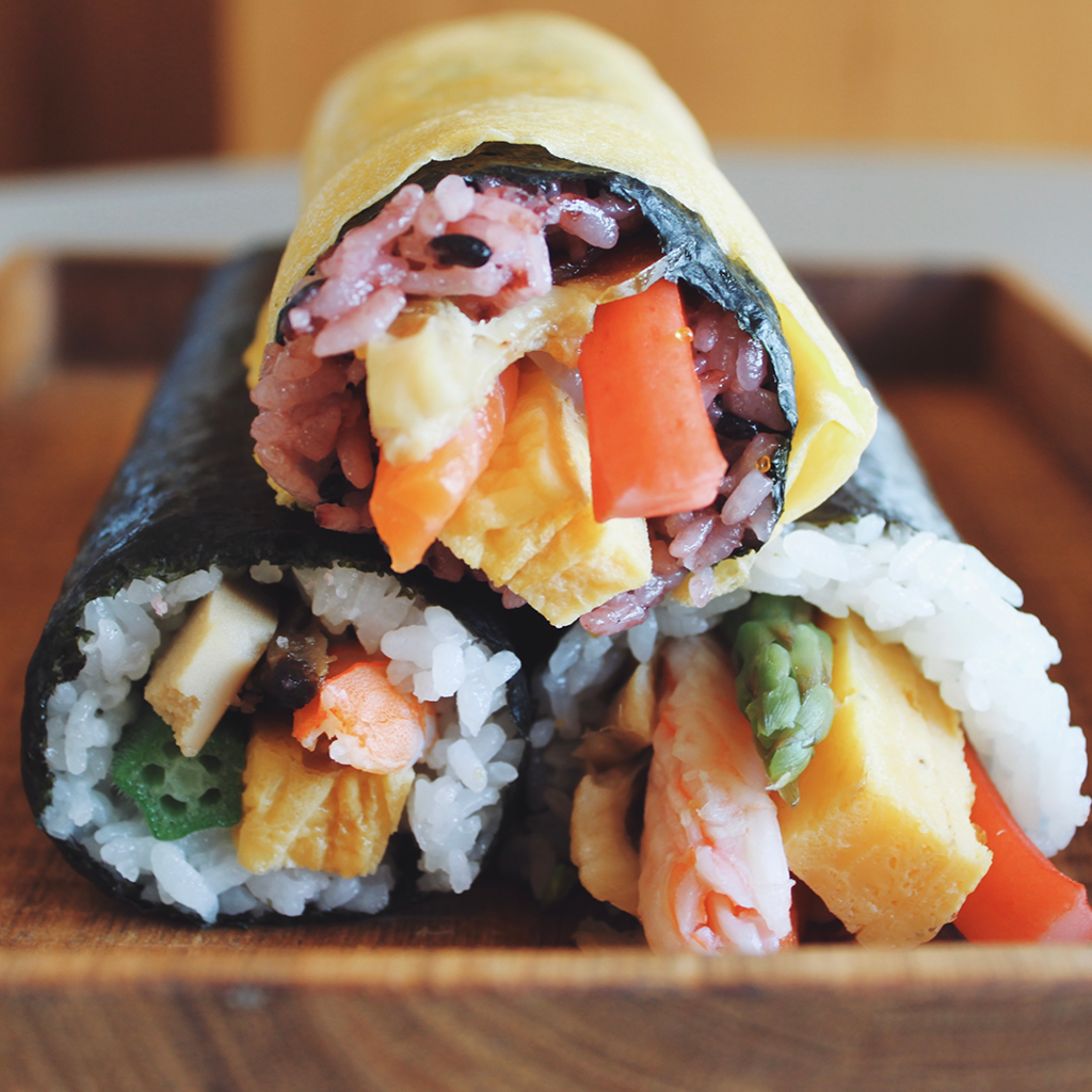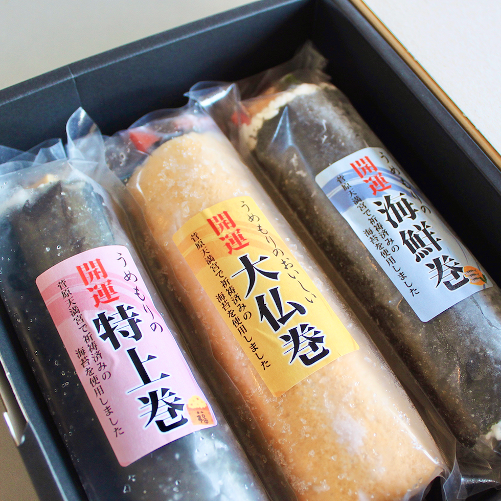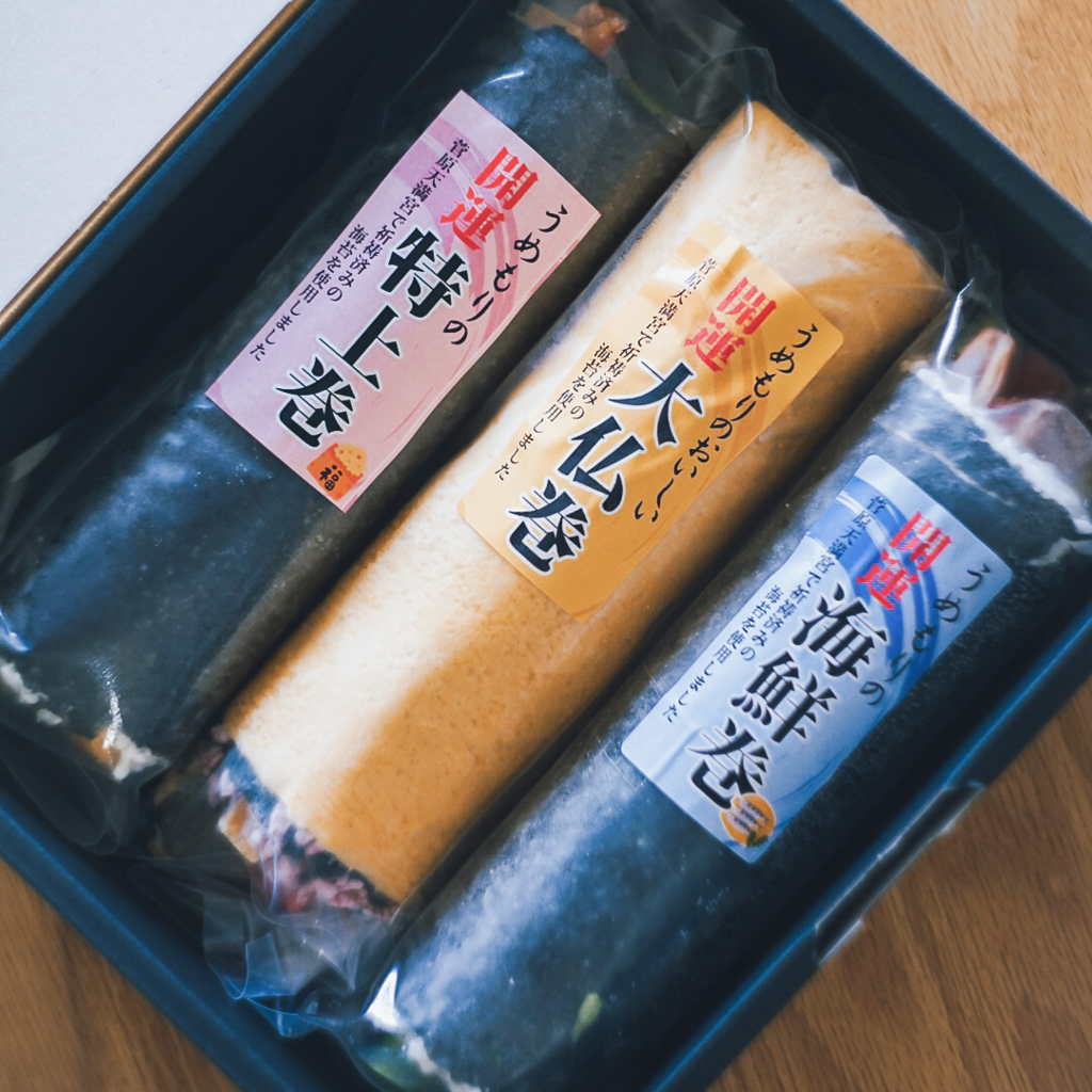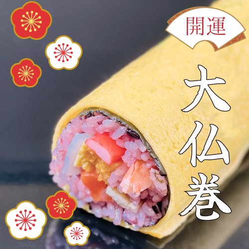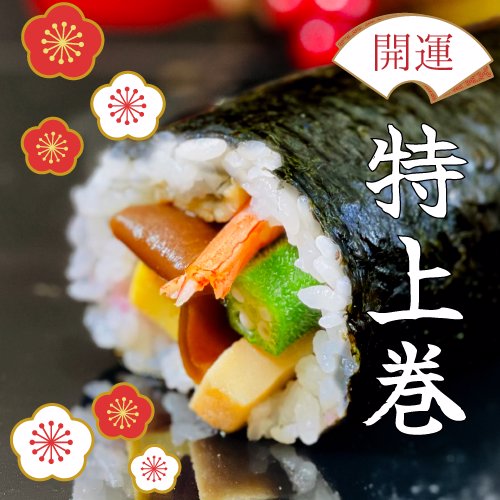 菅原道真公生誕の地「菅原天満宮」で厄除け開運祈祷済みの縁起の良い海苔を使用した縁起の良い恵方巻です。高野豆腐、干瓢、しいたけなど昔ながらの食材に、海老や穴子など少し贅沢に仕上げた『開運特上巻』もちもちとした食感の紫色の古代米を錦糸卵で巻き上げ、海老やサーモン、奈良漬けを使用したうめもりオリジナルの『古代巻』ふわふわの玉子に海老やサーモン、穴子など、贅沢な食材をふんだんに使用した『開運海鮮巻』のはるよび恵方巻の3本セットをご用意しました。是非お家で楽しめる春を呼び込むお品としてお召し上がりください。